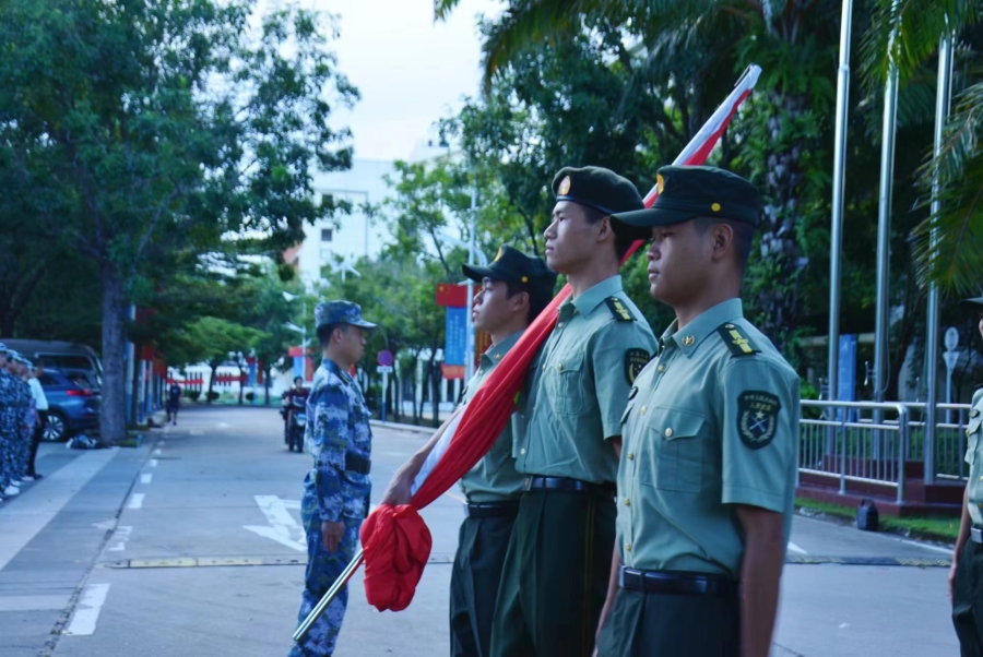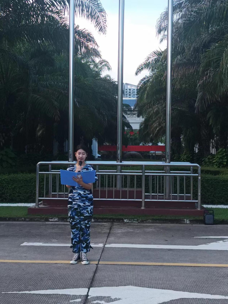 升旗仪式上,2023级新生代表王璐发言:今年是“九一八”事变爆发92周年,我们端起历史的望远镜能够更清晰地回望,获得更深沉的思考。如今硝烟散尽,但记忆永不褪色,我们要牢记这段刻骨铭心的历史。刚经历过紧张的高三备考生活,伴随着夏日炎热,我们与大学邂逅,迎来了严酷的军训。身为老员工的一员,我们应该成为文化水平高,专业能力强,具有国际视野的高素质人才,逐梦自贸港,青春永担当。作为新时代的接班人,我们要为中华之崛起而读书,要铭记习近平总书记对中国少年的期盼与激励,要在爱国主义的旗帜下团结一心,捍卫祖国尊严、维护国家主权与世界和平。