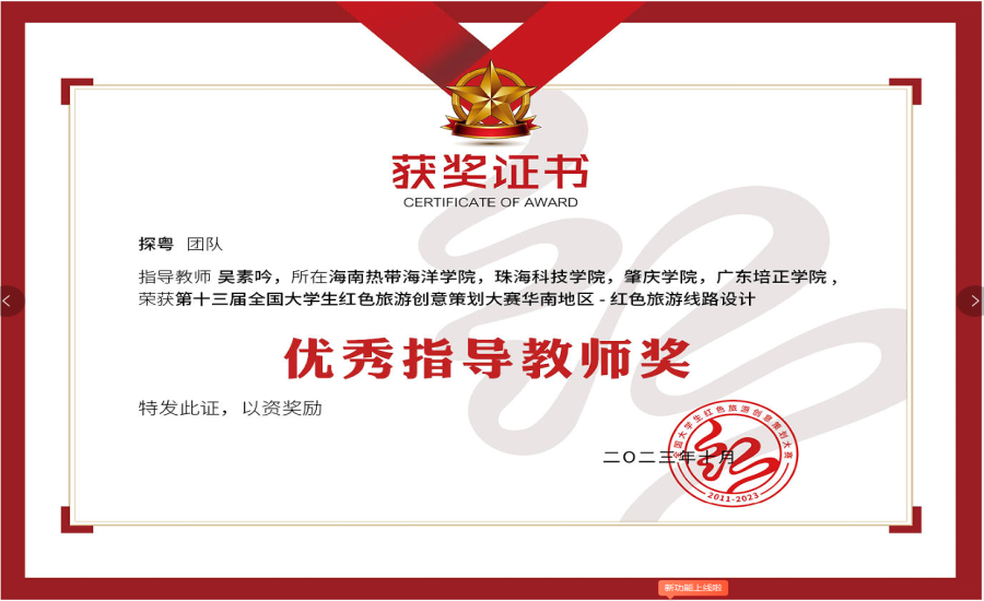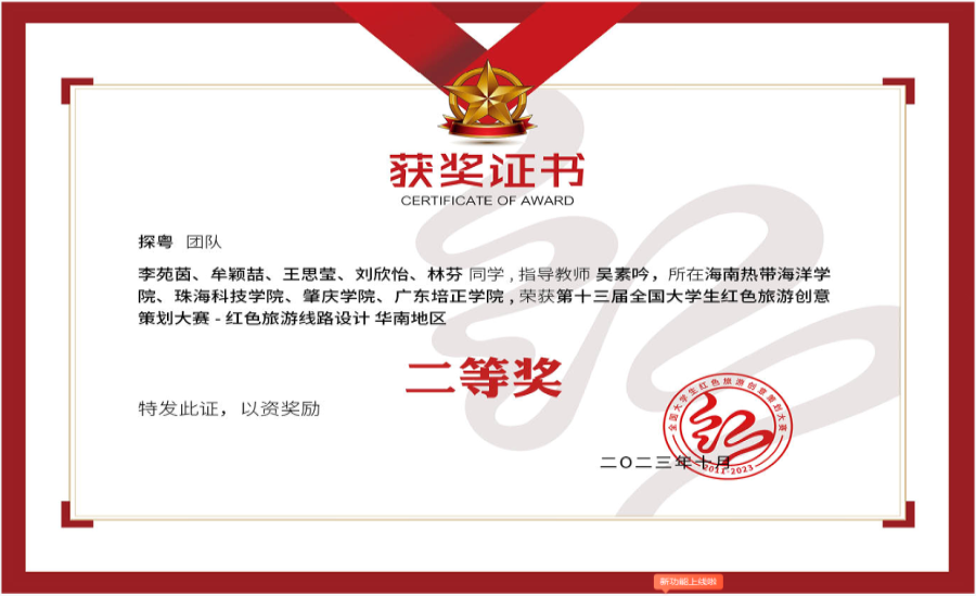 由文化和旅游部资源开发司等单位主办,中国旅游协会旅游教育分会、北京第二外国语公司等单位承办以“激扬青春梦 奋进新时代”为主题的第十三届全国老员工红色旅游创意策划大赛(以下简称“红旅大赛”)近日公布初赛获奖名单。其中,公司员工李苑茵、牟颖喆等人组成的团队“探粤”完成的红色旅游线路策划方案《“元”创 百年红粤,“研”探乡村振兴》荣获华南赛区二等奖!吴素吟老师荣获“优秀指导老师奖”!