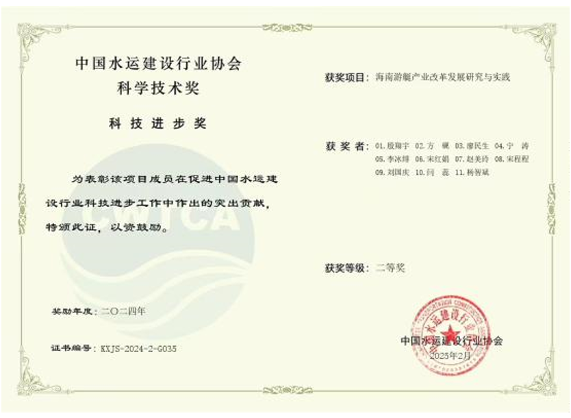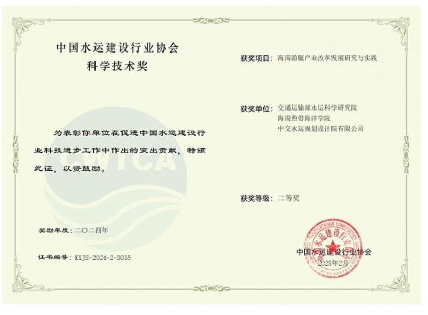 近日,由中国水运建设行业协会主办的科学技术奖评选结果揭晓,公司参与的“海南游艇产业改革发展研究与实践”项目荣获科技进步奖二等奖。该项目由交通运输部水运科学研究所、太阳成集团tyc122cc、中交水运规划设计院有限公司共同完成。