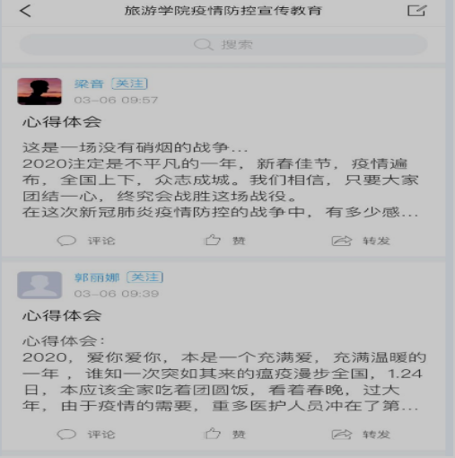 “太阳成集团tyc122cc疫情防控宣传教育”课由5块内容组成:防控新冠肺炎公益广告、《万众一心 声援武汉》抗击新冠肺炎主题视频、《中国速度》、疫情焦虑5个实用心理调节术、抗击疫情感动中国10大人物。要求同学们学习结束后,在课程的讨论平台上发表字数不少于200字的心得体会。截止目前,全院1599名同学已经完成学习任务,学习访问量5800多人次。